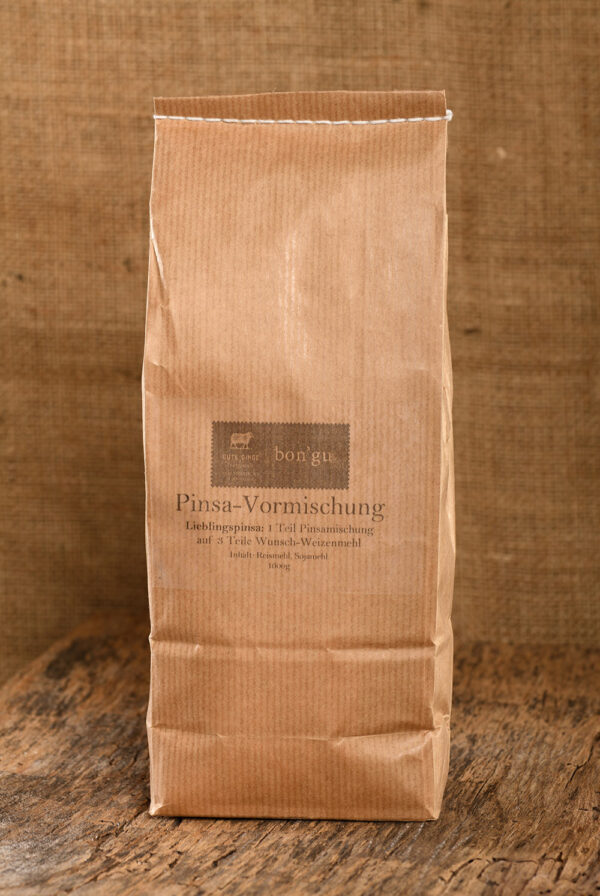 Unsere Pinsa-Vormischung! Die eigene Pinsa mit Riesenbubbles und zarter Kruste gelingt optimal, weil die traditionellen Zutaten zusammen mit dem besten Mehl mit den im Teig landen! Man nehme z.B. klassisch unser zertifiziertes Pizzamehl Vera und füge ein Fünftel bis ein Drittel der Menge an Pinsa-Vormischung hinzu. Warum Pinsa? Sie ist durch die Zugabe von Reis- und Sojamehl eine eigenständige Gattung. Gebäckgeschmack, Textur und Sättigung sind mit dem Pizza-Genre bei ähnlichem Aussehen nicht zu vergleichen. Vielleicht liegt es an der größeren Protein-Portion, die das Sojamehl liefert? Traditionell wird die Pinsa Romana länglich ausgezogen, der Rand bleibt wie bei den modernen Pizzavarianten dickblasig. Beim Belag können alle von der Pizza bekannten Lieblingsausführungen durchdekliniert werden. Bianca oder Margherita. Tonno bis Hawaii. Oder, um eine länger sättigende Pinsa mit wilder Porung auf den Tisch zu zaubern, nimmt man einfach das Antiqua als Grundmehl zusammen mit der Pinsa-Vormischung. Diese Idee verträgt gleichzeitig auch charakterstarke Kombinationspartner wie Gorgonzola/Birne.