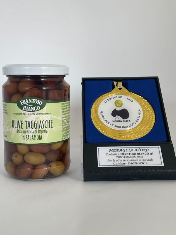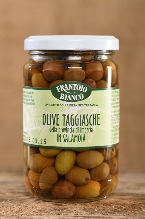Die Taggia-Olive ist wenig bekannt, das Anbaugebiet klein. Sie wächst in den Bergen an der Riviera, im italienisch-französischen Grenzgebiet. Wir haben nach langer Suche eine Familie gefunden, die diese Oliven seit 5 Generationen anbaut und auf dem neuesten Stand der Technik (und Hygiene!) traditionelles Wissen mit modernen Verfahren auf’s Beste vereint. Die Olivenbäume stehen alle am Steilhang, sie werden zwangsläufig mit der Hand geerntet. Aus Kostengründen ist nur ein kleiner Teil der Ware Bio-zertifiziert. Die Oliven selbst werden komplett auf die gleiche Weise behandelt. Die Ware unterscheidet sich nur durch das Etikett.