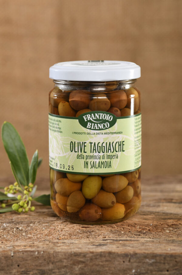 Das Original aus Ligurien: Ganze Feinschmecker-Olive in Salzlake. Beste Taggiasche Oliven aus dem Anbaugebiet Taggia.
