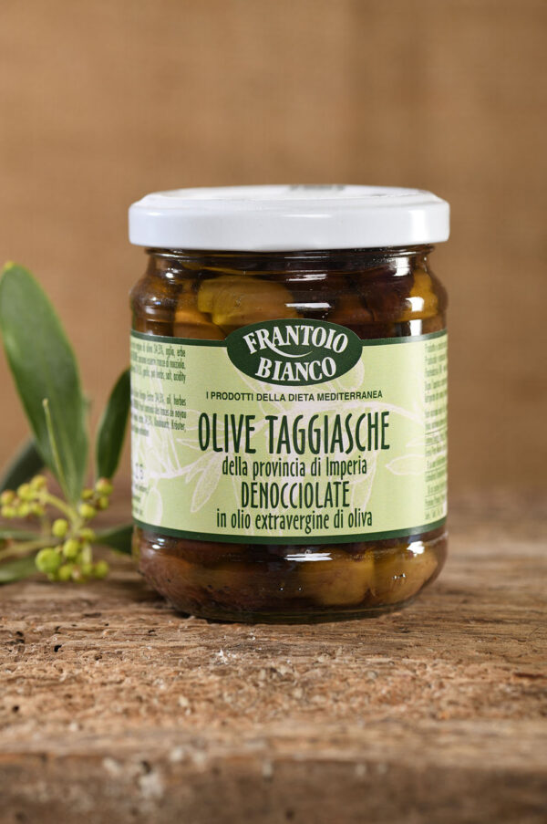 Das Original aus Ligurien: Entkernte Feinschmecker-Olive in Olivenöl. Zum Kochen oder für im Salat, voll, außergewöhnlich dichtes, feines Aroma.